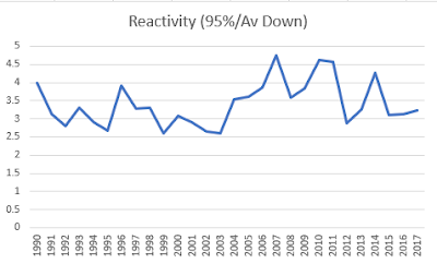 It is hard to make an argument that the relative up moves are increasing. While 2014 was the 3rd highest year, 2015 and 2016 were closer to the bottom the range. Overall, the average pre-2012 ratio was 1.208, and afterwards it was 1.213.